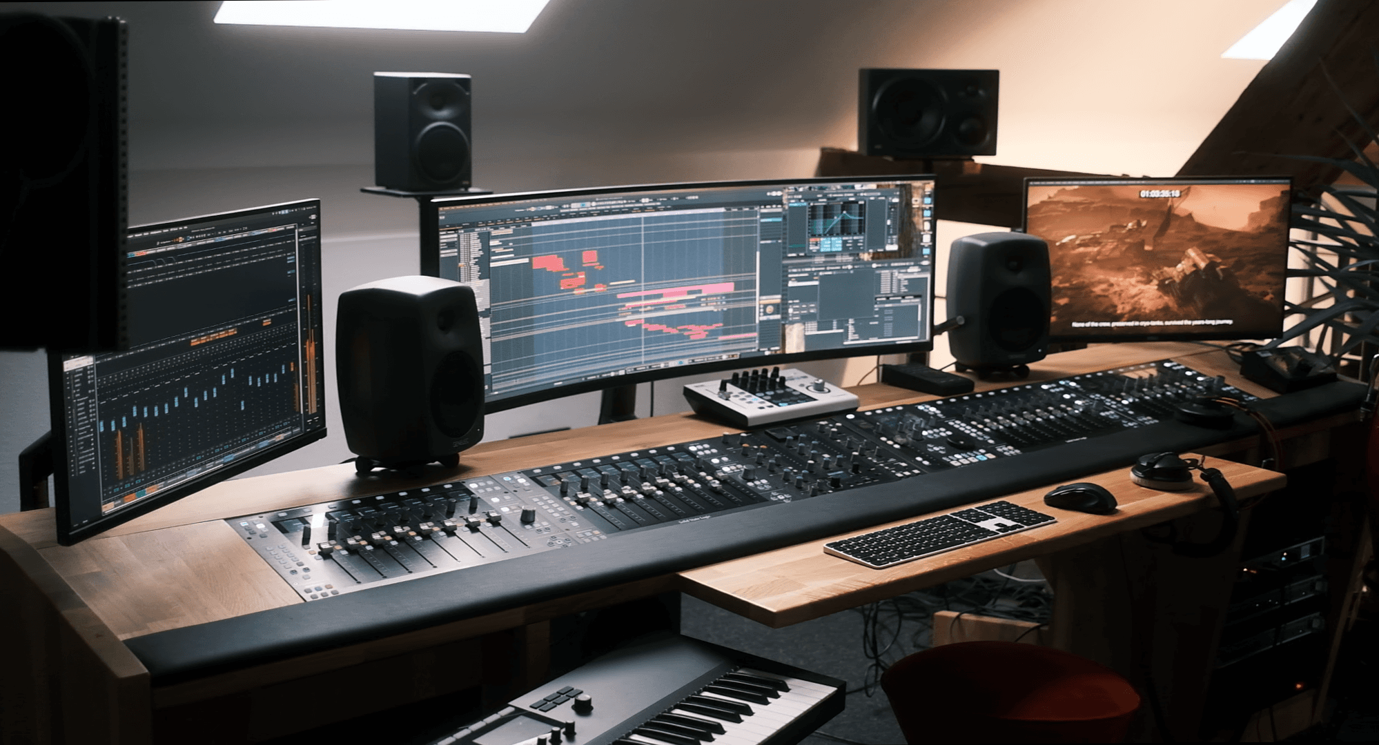 Unser Studio ist mit hochwertiger Technik ausgestattet — Mit Stereo-, Surround- und Dolby-Atmos-Monitoring auf Neumann- und Genelec-Systemen entstehen Produktionen mit außergewöhnlicher Klangtiefe.